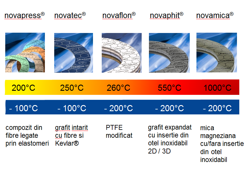 - Materiale: diverse, in functie de aplicatie (grafit expandat, fibra armata, PTFE, cauciuc rezistent la abur etc.)